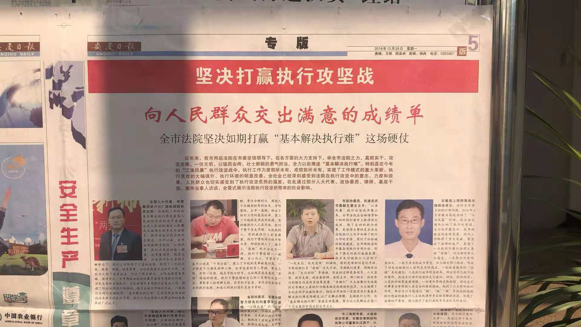 近年来,安庆市各级法院倾全院之力,真抓实干,攻坚克难,以壮士断腕之勇气与担当,全力以赴推进“基本解决执行难”,特别是在今年的“江淮风暴”执行攻坚战中,执行工作力度和工作成果明显提升,全社会深刻感受到法院在执行攻坚中的意志、力度和效果。2018年10月29日,安庆日报刊登标题为《向人民群众交出满意的成绩单—全市法院坚决如期打赢“基本解决执行难”这场硬仗》报道,通过部分人大代表、政协委员、律师、基层干部、案件当事人访谈,展示法院执行攻坚所带来的社会影响。我所主任、党支部书记徐孝云律师受邀发表评论。