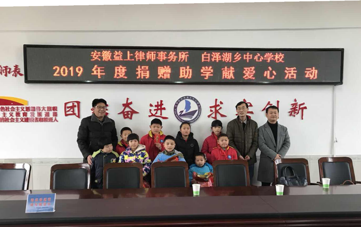 2019年2月1日上午,安徽益上律师事务所党支部书记徐孝云同志、副书记陈磊同志等一行前往安庆市白泽湖乡中心学校进行爱心助学活动,将书包等学习物资送到了孩子们的手中,并发放了助学金。