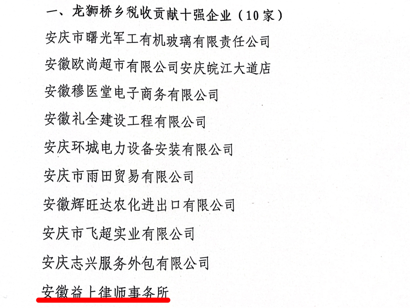 2022年,安徽益上律师事务所上下坚持以习近平新时代中国特色社会主义思想为指导,全面贯彻落实党的二十大精神,坚决贯彻落实党中央国务院决策部署和省委省政府、市委市政府、区委区政府工作要求,较好完成了全年目标任务,荣获2022年度龙狮桥乡税收贡献十强企业称号。